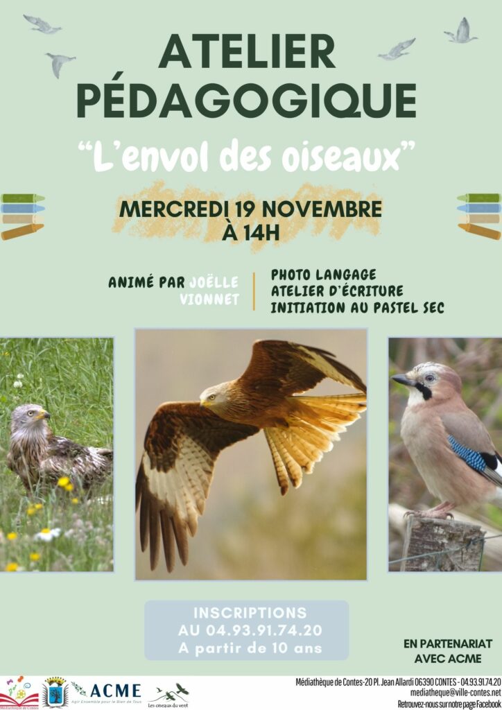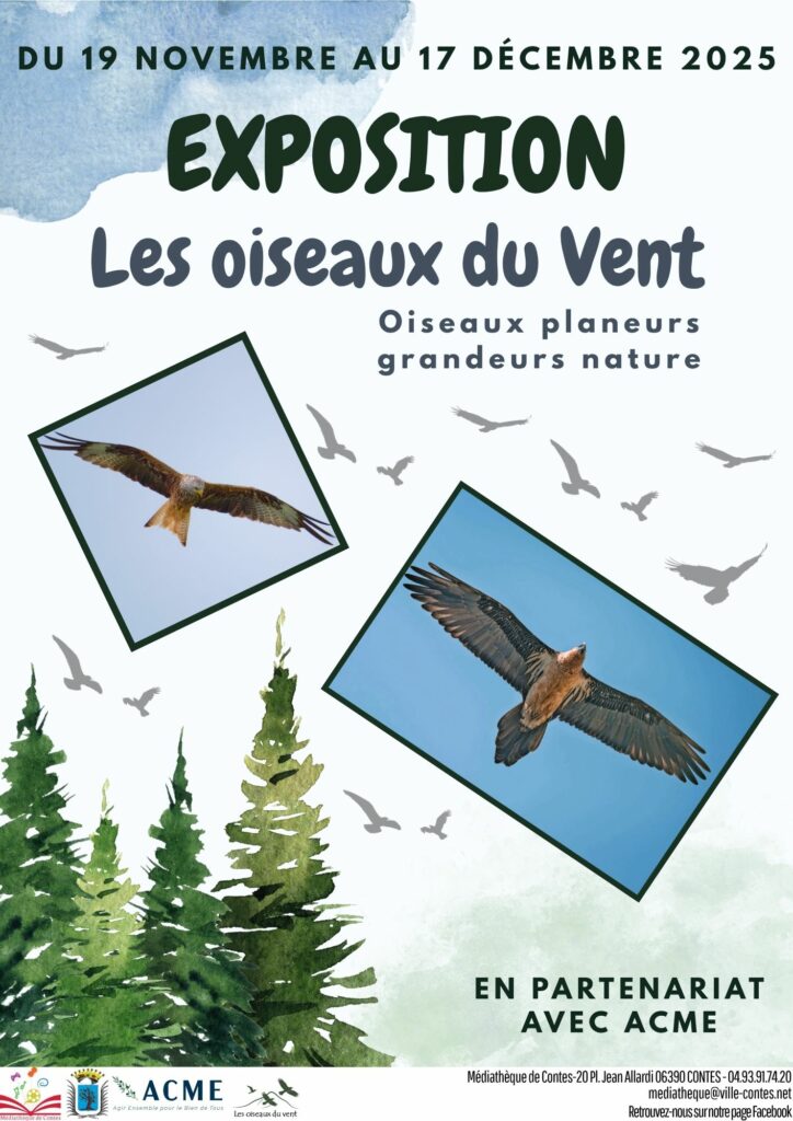 Trois temps pour mieux connaître et admirer les oiseaux planeurs, en partenariat avec la Médiathèque de Contes. Un atelier pédagogique puis une conférence le 19 novembre 2025, prolongé par une exposition du 19 novembre au 17 décembre à Contes.